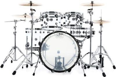 One type of drum kit that will always work well in metal settings is an acrylic kit. Acrylic kits are those transparent ones. They’re punchy and loud, much louder than a standard wooden kit. They tend to be quite pricey, luckily DW offers an acrylic version of their Design Series kit.